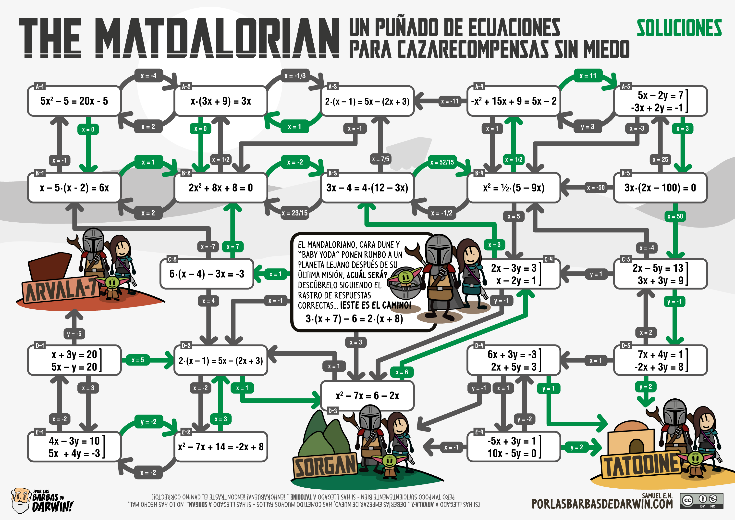 Después del repaso de las ecuaciones de primer grado, llega una nueva entrega de The Matdalorian para mis alumnos de Ámbito Científico-Matemático [PMAR II]. Por falta de tiempo se me han quedado en el aire la 2ª y 3ª parte que tenía previstas, pero a estas alturas de curso tocaba hacer repaso de los distintos tipos de ecuaciones vistos hasta el momento y no quería perder la oportunidad de terminar con este tipo de recurso.